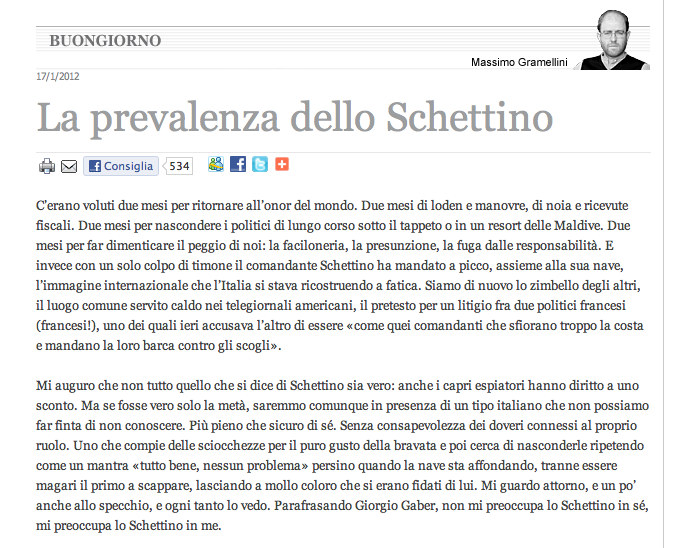 non sono per niente d'accordo. sarà anche vero che nella comunicazione mediatica può prevalere il personaggio negativo del capitano rispetto a un esercito di personaggi positivi (comunità del Giglio, di Porto S. Stefano, protezione civile in senso ampio del termine, membri dell'equipaggio, alcuni naufraghi, ecc.), ma se questa specie di autocommiserazione e di autodisprezzo siamo noi stessi a esaltarla allora forse ce la meritiamo anche.
