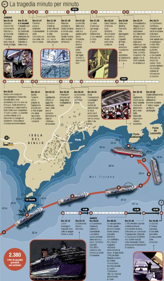 non pesco solo io non nuoto solo io .... pensate a una nave di quella portata quanto mare serve per manovrare in caso di situazioni di emergenza e navigando vicino d'agosto quante situazioni si potevano prospettare...... la manovra azzardata l' avete ampiamente documentata....fate le voi le debite conclusioni.. !!! a Napoli e dintorni dicono ci "risfessea...." Nel nostro piccolo della generazione dei "chiattini" ci sono vari comandanti e ufficiali di macchina tuttora operanti...Ora se si mette mare e si "Sganascia" si famo due risate...anzi piangiamo amaramente!!!! DISPERSI A PARTE ....ciao...