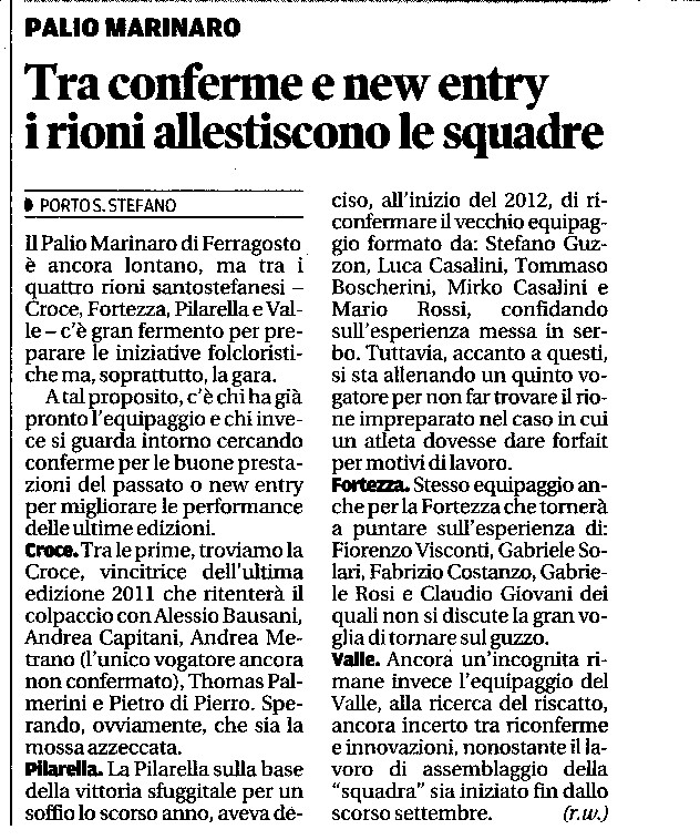 Il Palio Marinaro di Ferragosto si avvicina e tra i quattro rioni santostefanesi, Croce, Fortezza, Pilarella e Valle, c'è gran fermento per preparare le iniziative folcloristiche ma, soprattutto, la gara. A tal proposito, c'è chi ha già pronto l'equipaggio per il 2012 e chi invece si guarda intorno cercando riconferme e new entry. Tra le prime ad aver completato i cinque elementi la Croce, vincitrice dell'ultima edizione 2011 e che ritenterà il colpaccio con Alessio Bausani, Andrea Capitani, Andrea Metrano (l'unico vogatore ancora non confermato), ..... continua