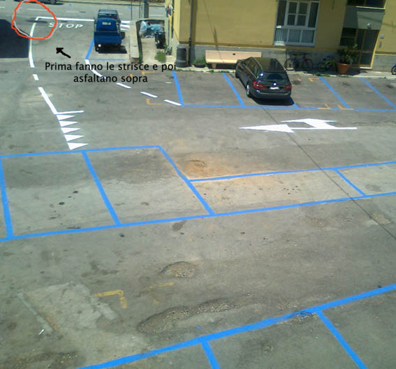 Assurdo dell'assurdo: siccome una delle buche era fonda come se ci fosse esplosa una bomba cosa hanno fatto? hanno fatto prima la striscia e poi l'hanno coperta con un goccio di asfalto cosi ora linea è rimasta spezzata mah
