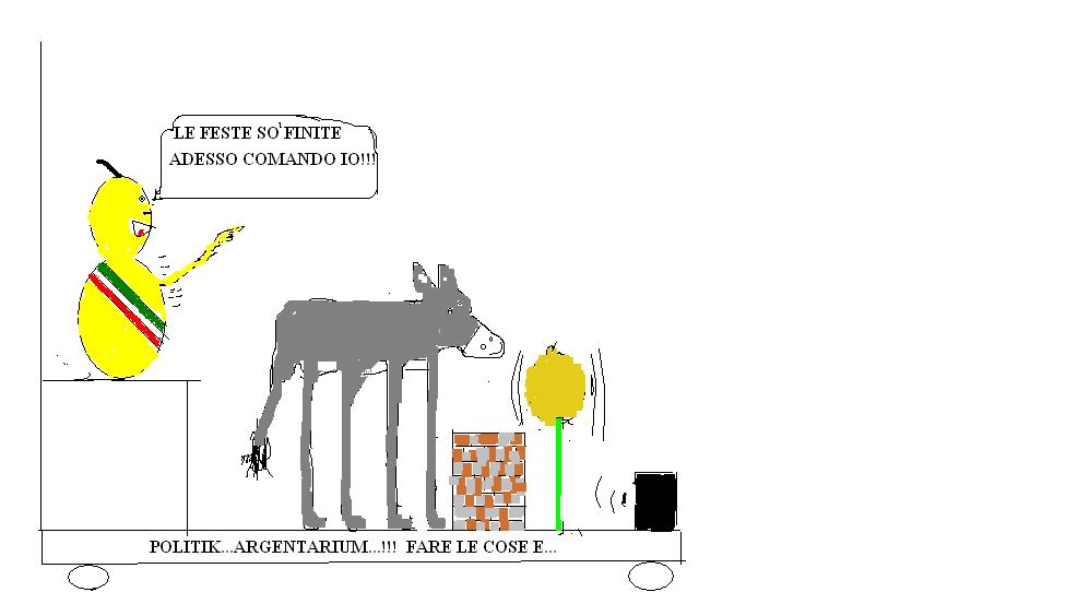 ecco a voi il carro...rappresenta il sindaco che porta la legalità in un momento dove "il somaro" aveva portato la cementificazione dell argentario (rappresentata dal muro) e un "cecio" che gira perche non sà che fa...