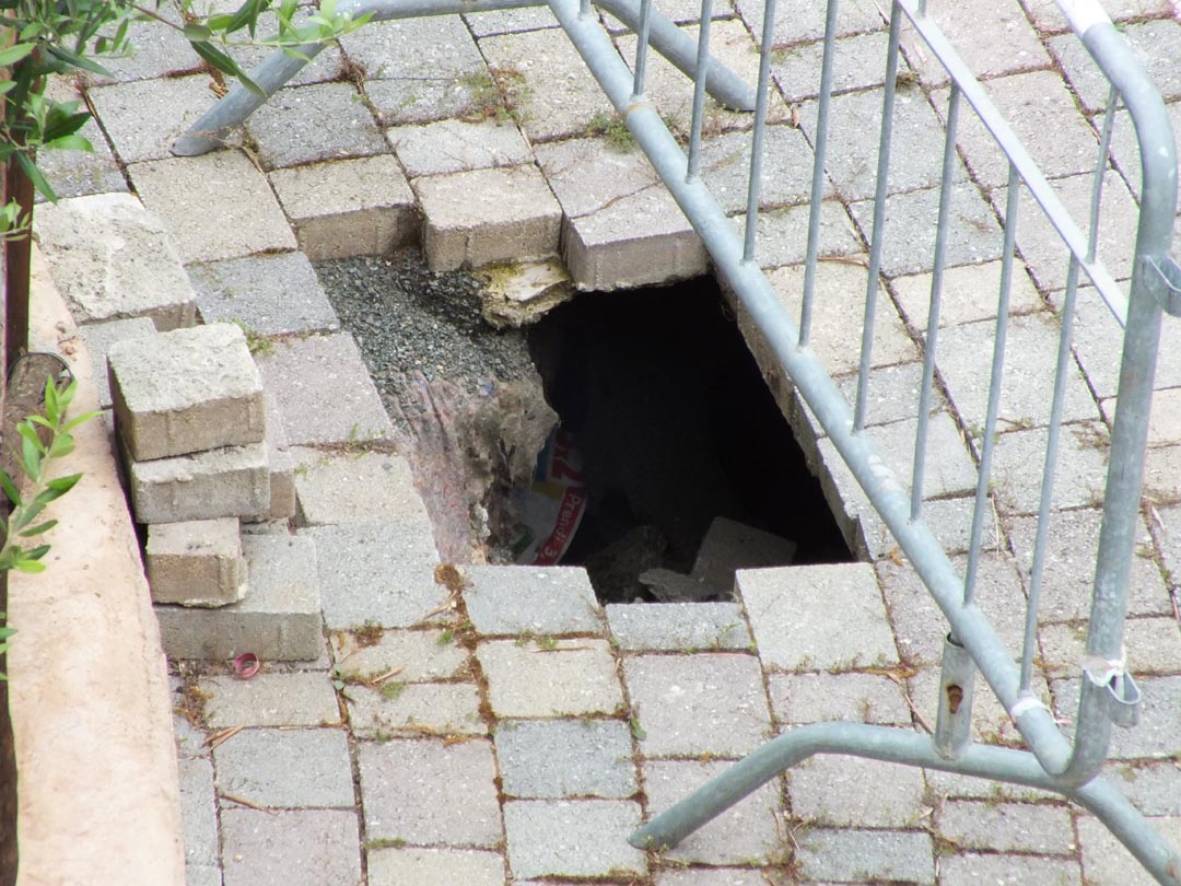 per uanto riguarda l'avvallamento...in genere quel tipo di avvallamento si crea a seguito di una riparazione di una perdita idrica (dopo qualche mese dalla riparazione)... probabilmente c'è il tubo di collegamento bucato o il pozzetto della grata rotto...