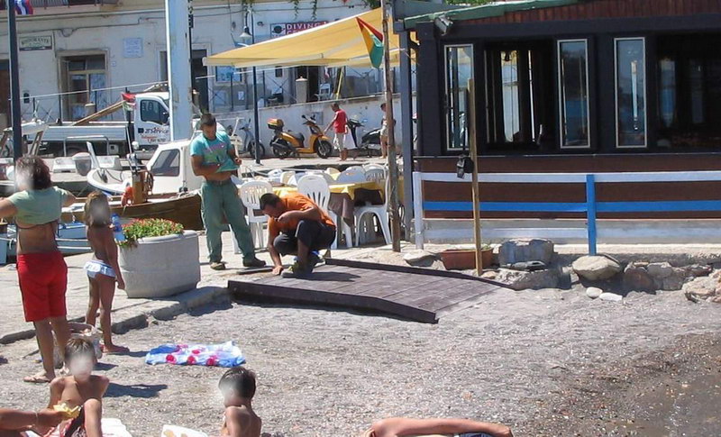 Mi domando a che cosa serve quella pedana?! Non mi dicano che è un superamento per barriere architettoniche, ché non ci credo... perché ormai come è messa quella "spiaggia"*, non penso che un disabile possa transitare senza avere qualche problema.