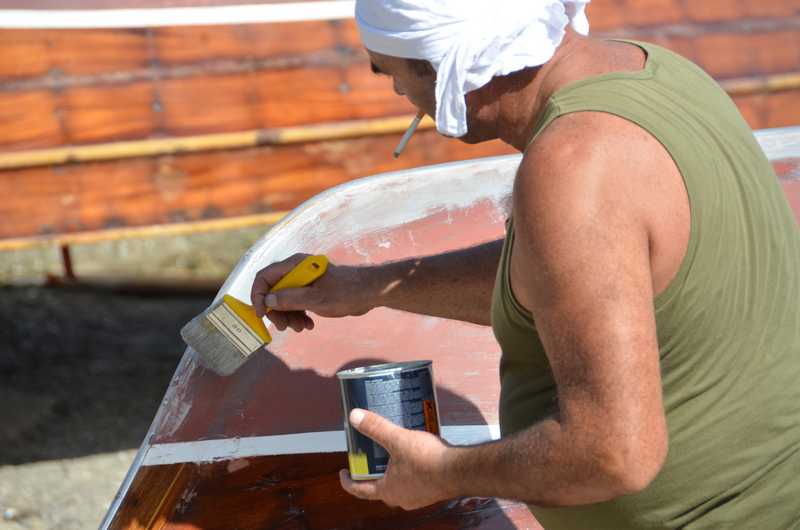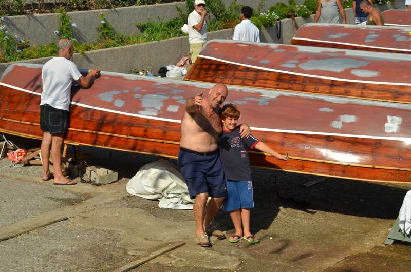 Emilio Zi Moro e Renzo Paperino osservano con occhio critico i lavori alle carene dei battelli.