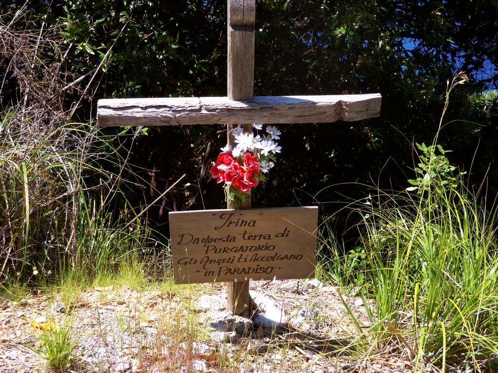 la croce della povera irina è subito dopo la strada che scende verso il purgatorio, venendo da p.ercole