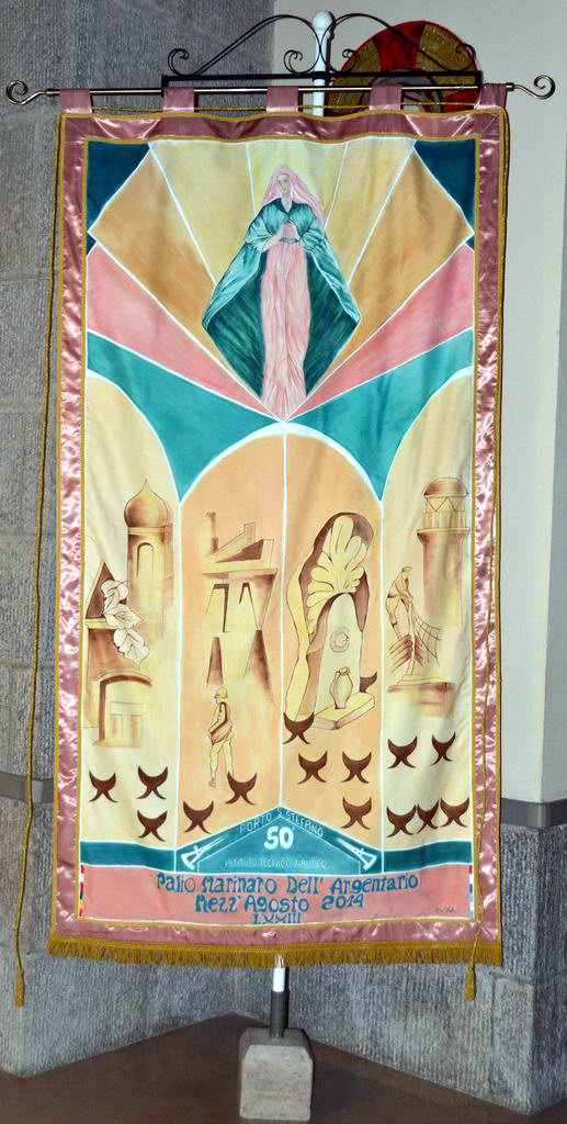 Ecco lo stendardo del Palio realizzato dall'artista Mara Scotto. Come evento ricorda il 50° anniversario dell'apertura dell'Istituto Tecnico Nautico e noto che gli stemmi dei rioni sono quelli che, in ferro battuto, sono in bella vista sulla facciata dell'istituto in via Panoramica. Sicuramente pochi l'avranno notati, io li conosco bene essendo 35 anni che ci lavoro.