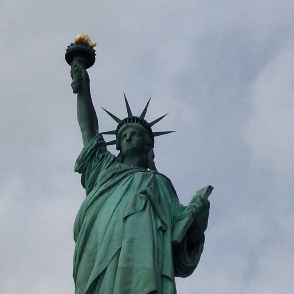 Immagine: 101,82 KB Con i suoi 93 metri d'altezza, che dominano l'intera baia di New York, essa risulta perfettamente visibile fino a 40 chilometri di distanza. Raffigura una donna che indossa una lunga toga e sorregge fieramente in una mano una fiaccola (simbolo del fuoco eterno della libertà), mentre nell'altra tiene un libro recante la data del giorno dell'Indipendenza americana (4 luglio 1776); ai piedi vi sono delle catene spezzate (simbolo della liberazione dal potere del sovrano dispotico) e in testa vi è una corona, le cui sette punte rappresentano i sette mari o i sette continenti.