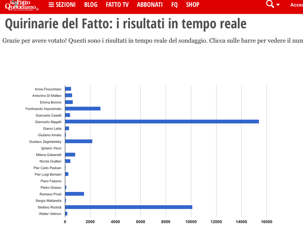 Dai giù, non cogli l'ironia e il sarcasmo di quei nomi[:o)?] Io c'avrei messo pure Cino Tortorella/Mago Zurlì !! Vedo però che Renzi da rottamatore sprecone, in tempi di crisi si da al riciclaggio: Amato!! D'Alema!! Casini!!ma dai!! So' nomi da fassi questi! Ora pare che il nome di punta sia Mattarella, ministro sotto Andreotti e De Mita Non dico un partigiano perché l'anagrafe ormai ha detto la sua, ma non c'è proprio nessun'altro??? Quasi quasi c'ha ragione Sgarbi a fare il nome di Riccardo Muti. E se donna deve essere perché no Maria Falcone?