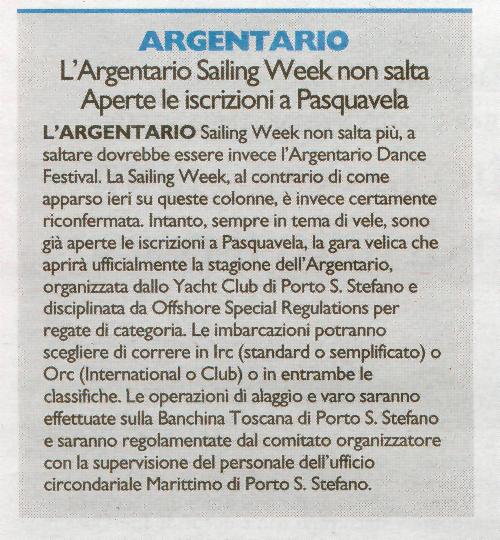 Personalmente, sono felice che la Sailing Week non salti!! E mi dispiace se salta l'Argentario Dance festival che nn è certo un saggio di danza ma una manifestazione internazionale e molto bella!! Spero che nn salti proprio nulla!!