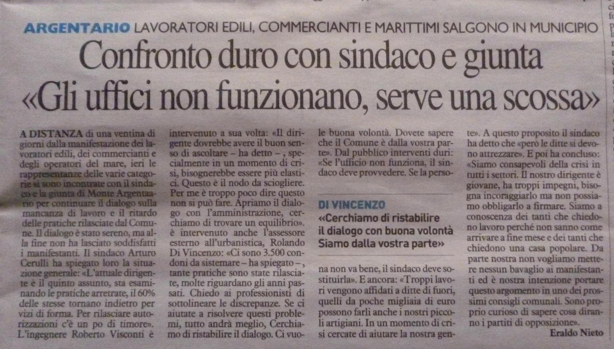 ero presente alla riunione , diciamo che e ' stato un confronto tra ammi . ne e l ' edilizia , oltre ai lavoratori del mare non c ' erano rappresentazioni di altri che avevano partecipato alla manifestazione , sapete che mi duole dirlo ma nel confronto a prevalso il sindaco .
