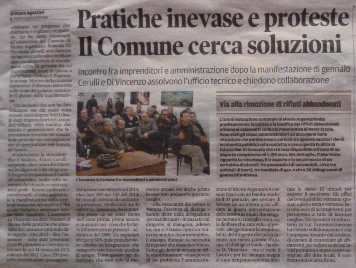 Ieri sera, come concordato al termine della manifestazione del 26 gennaio, c'è stata la riunione fra l'Amministrazione ed una delegazione dei manifestanti . Per i manifestanti (crisi per il lavoro che non c'è per le nostre ditte edili) hanno parlato soprattutto i tecnici Roberto Visconti, Mauro Ghini e Lorenzo Bracci e l'impresario Roberto Figara. Tra la quarantina dei rappresentanti c'erano anche dei "curiosi" che non avevano manifestato ma che hanno pensato di venire per non perdersi l'occasione .... non c'erano invece politici ufficiali anche se c'erano molti Sindaci in Pectore ...