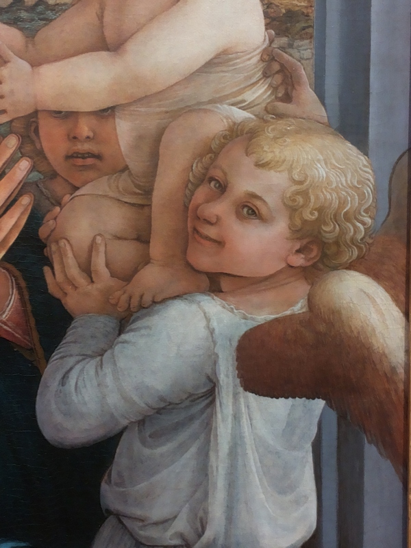 Un particolare della Madonna col Bambino di Filippo Lippi, il frate innamorato della bellissima monaca sua modella, dalla quale ebbe il figlio Filippino, altro grandissimo pittore. Bella l'espressione dell'angioletto, ha un che di dispettoso no??