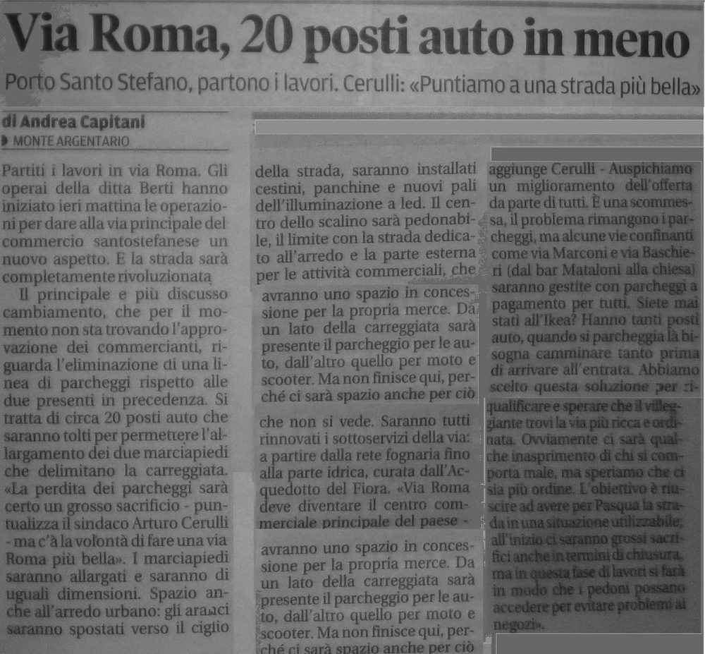 Non capisco questa ostinazione a creare disagi sia ai commercianti, ancora aperti e sia agli abitanti della via. Via Roma è una via commerciale e non una via di passeggio. Le persone ci vengono a fare la spesa e se ne vanno, quindi eliminare la possibilita di sostare ad un centinaio di auto al giorno vuol dire solo creare disagi ai paesani e turisti, senza contare le difficoltà che incontreranno quelle persone con difficoltà motorie che saranno costrette a parcheggiare a centinaia di metri da casa, come queli che dovranno portare la spesa fino a casa. Perché il sindaco non vuol tenere in considerazione questi problemi? Perché i consiglieri di maggioranza non tengono conto delle difficoltà che si creeranno a fine lavori? Alle prossime amministrative, quando andranno a chiedere voti, non vadano a dire che non è stata colpa loro, perché la responsabilità è di tutti.