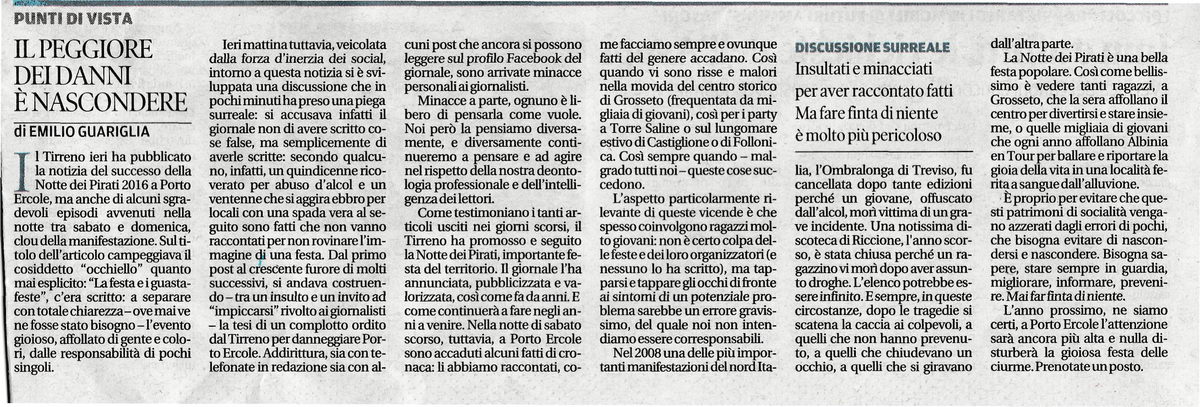 mi scuso se in questi giorni scriverò meno in questo forum...ma siamo tutti impegnati...io (e A.C.) compreso... in una lunga discussione causata da una giornalista del Tirreno che della Notte dei Pirati ha messo in rilievo in prima pagina 3 fatti negativi... una è il fatto che un ragazzetto aveva bevuto un pò troppo...e l altro che una coppia grande che faceva le COSE ...no sul lungomare come dice l articolo...ma appartati in una via secondaria dietro una cabina del telefono!!... (c'è gente che ha visto che può testimoniare)