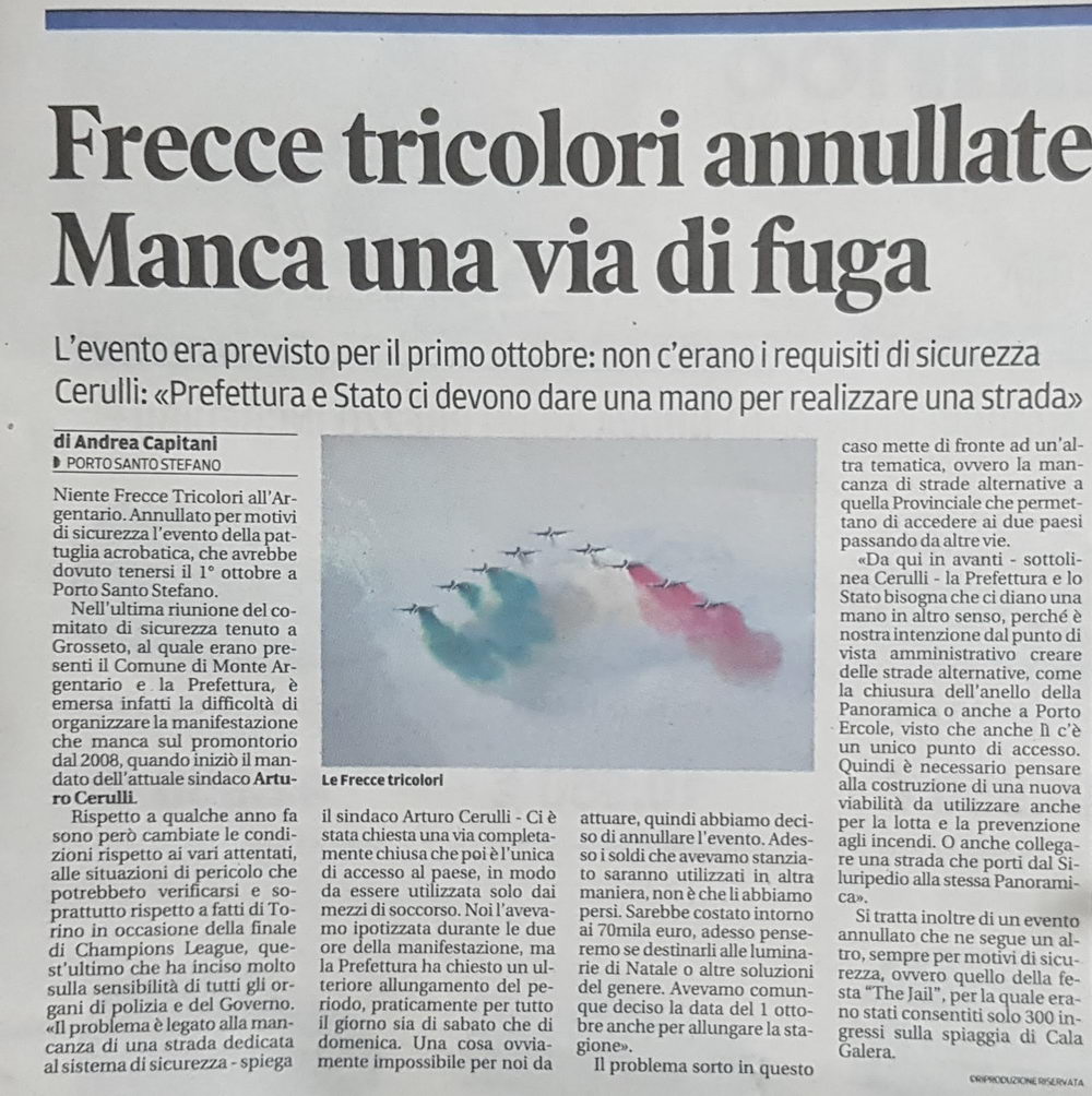 Però noi del GAT, ci battiamo da anni per la ciclopedonale P.S.Stefano- Orbetello; aldilà del caso specifico di manifestazioni così importanti come quella delle frecce, se capita un incidente ed un camion va di traverso per esempio alla Soda, non c'è più passaggio per un'ambulanza che ha urgenza di andare all'ospedale. Invece aprendo la ciclopedonale ai mezzi si potrebbe bypassare il problema e forse con questa motivazione si riuscirebbe ad espropriare i terreni vicini ai fori, per la creazione del percorso alternativo.
