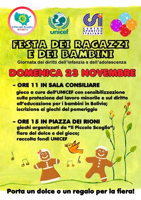 L’associazione culturale “Il Piccolo Scoglio” in occasione della giornata mondiale per i diritti dell’infanzia e dell’adolescenza organizza Domenica 23 Novembre a Porto S.Stefano un evento in collaborazione con l’UNICEF di Grosseto e il CSI “Don Bastianini”. La mattina sarà previsto un gioco interattivo con i bambini a cura della collaboratrice del comitato nazionale dell’UNICEF Coranna Coradazzi che esporrà inoltre il progetto relativo alla protezione dal lavoro minorile e al diritto all’educazione per i bambini in Bolivia. Nel pomeriggio verranno svolti alcuni giochi a cura della nostra associazione e in seguito una fiera di beneficienza per la raccolta di fondi da destinare all’UNICEF. Per questo motivo invitiamo tutti a portare dolci o regali che verranno esposti sotto un gazebo allestito per l’occasione.