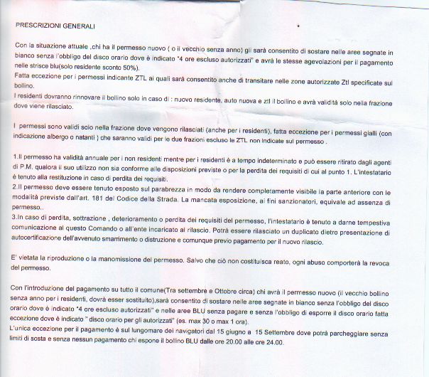 Meno male che io il bollino non l'ho ancora fatto, mi conviene farlo a gennaio così pago solo €10,00 anziche €20,00, visto che quelli attuali non hanno il codice a barre. Poi mi dovranno spiegare a che cosa servirà, non siamo mica ad Orbetello che i posti auto sono in numero superiore alla richiesta dei residenti, visto che i posti auto non sono sufficenti, d'inverno figuriamoci d'estate. E' una legge di mercato, prima si fanno i parcheggi, offerta, in numero superiore alle necessità dei residenti, domanda, e poi si può fare come Orbetello(il residente non paga).