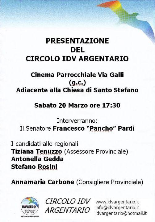 I ragazzi e le ragazze del Circolo IDV Argentario colgono l'occasione per invitare tutti gli utenti del forum alla presentazione del nostro circolo che si terrà questo sabato nel cinema parrocchiale di via Galli a Porto Santo Stefano alle ore 17 e 30. Vi sarà, tra gli altri, l'intervento del Sen. Francesco Pardi.