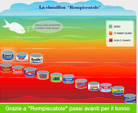 A tre mesi dal lancio della campagna “Rompiscatole” sulla sostenibilita' ambientale del tonno in scatoletta, le aziende produttrici cominciano a migliorarsi. Esselunga avrebbe deciso di non comprare piu' tonno trasbordato in mare, una pratica che favorisce molto spesso attivita' illegali. Callipo, non utilizzera' piu' del 25% di tonno pescato con sistemi di aggregazione per pesci, che spesso aggregano anche tartarughe, squali, delfini. Bolton, gruppo Riomare, si e' invece impegnato formalmente a predisporre una politica di sostenibilita' entro la fine dell'anno. Balza primo in classifica il tonno Asdomar, una delle poche aziende che utilizza tonnetti striati, una specie non in pericolo e pescata con ami e lenze.