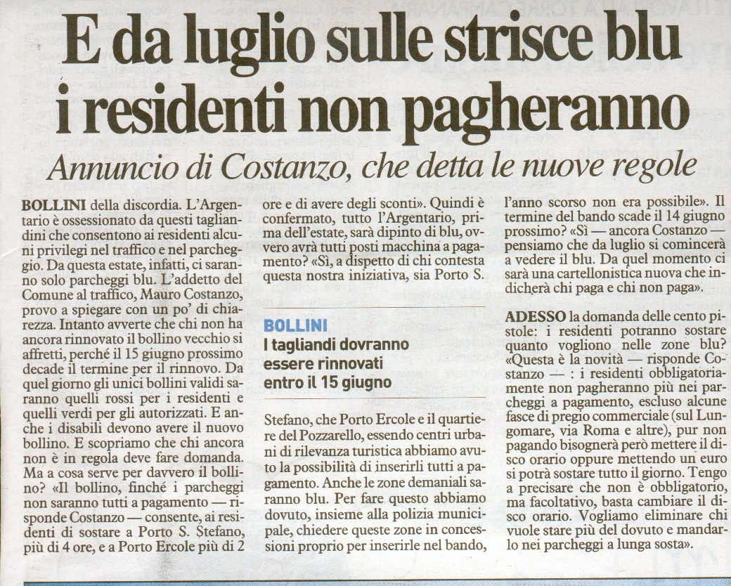 Forum di Monte Argentario punto it - Articolo sui bollini rossi per i parcheggi