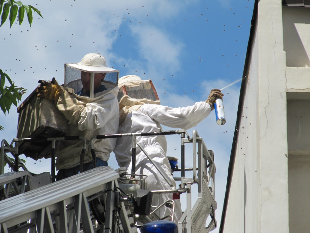 Io l'ho visto, è impressionante... certo per chi le api è un'occasione da non perdere, i Vigili del Fuoco offrono il mezzo per salire, ma non sono attrezzati ... se posso domani ci faccio una foto...