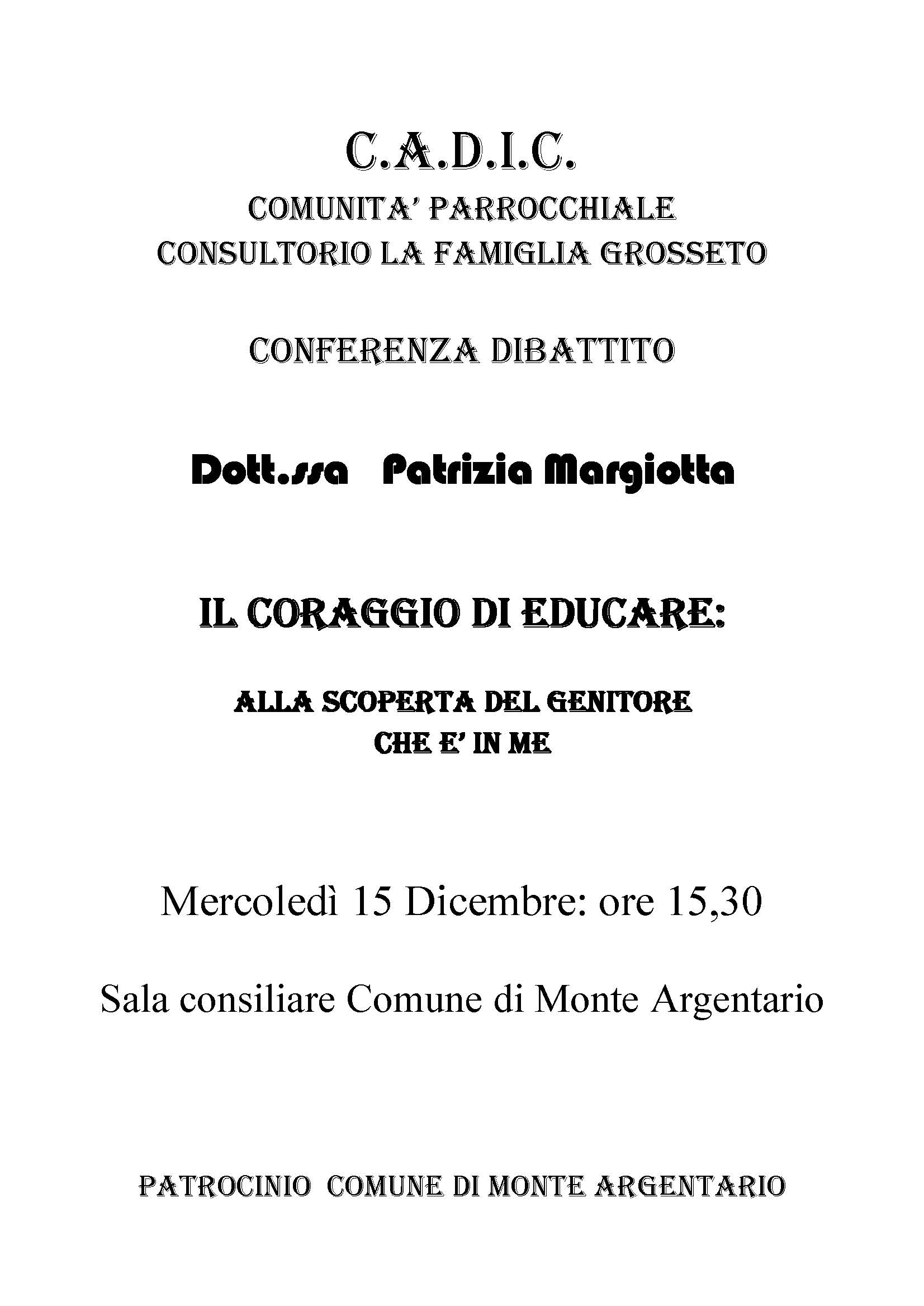 La CADIC, riprende il ciclo di conferenze per il progetto"Il coraggio di Educare". Tornerà la dott.sa Margiotta, per terminare un lavoro già iniziato.