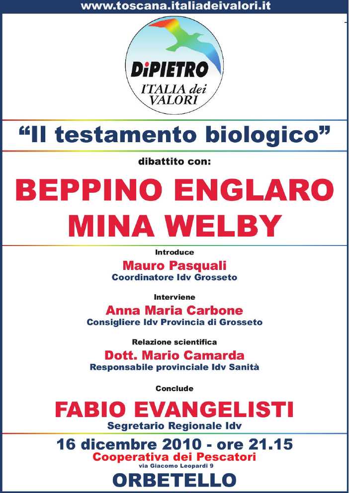 vi siete persi un evento interessantissimo e unico, emozionante, toccante ed utile per la vita, di quelli che rimangono dentro e fanno pensare parecchio. capisco che c'è freddo e che c' annozero, che all'argentario non abbiamo strutture per ospitare eventi di questo tipo e che a orbetello ci so gli orbetellani e il puzzo di marciume perenne...pero' mi so un po' rattristato di essere l'unico santostefanese,lo dico senza volermi elevare a niente, anzi,nè soprattutto riprendere nessuno,mi dispiceva solo non condividere tutto questo con persone che so che lo avrebbero trovato bello come l'ho trovato io... mi ero pure preparato un intervento ma era rivolto agli dell'Argentario e visto che non ce n'era nemmeno uno non l'ho fatto, al centinaio di orbetellani e albiniesi non gliene sarebbe fregato niente, pero' la proposta la fo qui: perchè non iniziamo dall'Argentario a raccogliere i nostri testamenti biologici in un registro nostro, anche solo a livello informativo e simbolico?se sono firmati in calce saranno validi anche a livello giuridico sperando che non debbano mai esserlo. lo so che magari detto cosi' viene da toccarsi i cosi per che ce li ha, ma dopo aver sentito di persona certe testimonianze senza uno schermo davanti certe domande te le fai....a volte mi chiedo se sia meglio non farsele per niente e lasciare decidere i soliti, accennando una smorfia di indignazione quando qualcosa che vediamo in quell'acquario con tutti quei nani e ballerine dentro non ci torna...poi tanto cambiamo canale e ci ritorna di nuovo tutto