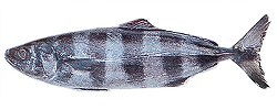 Colorazione azzurro-argentea con larghe fasce verticali azzurro scure. Lunghezza 30-70 cm.